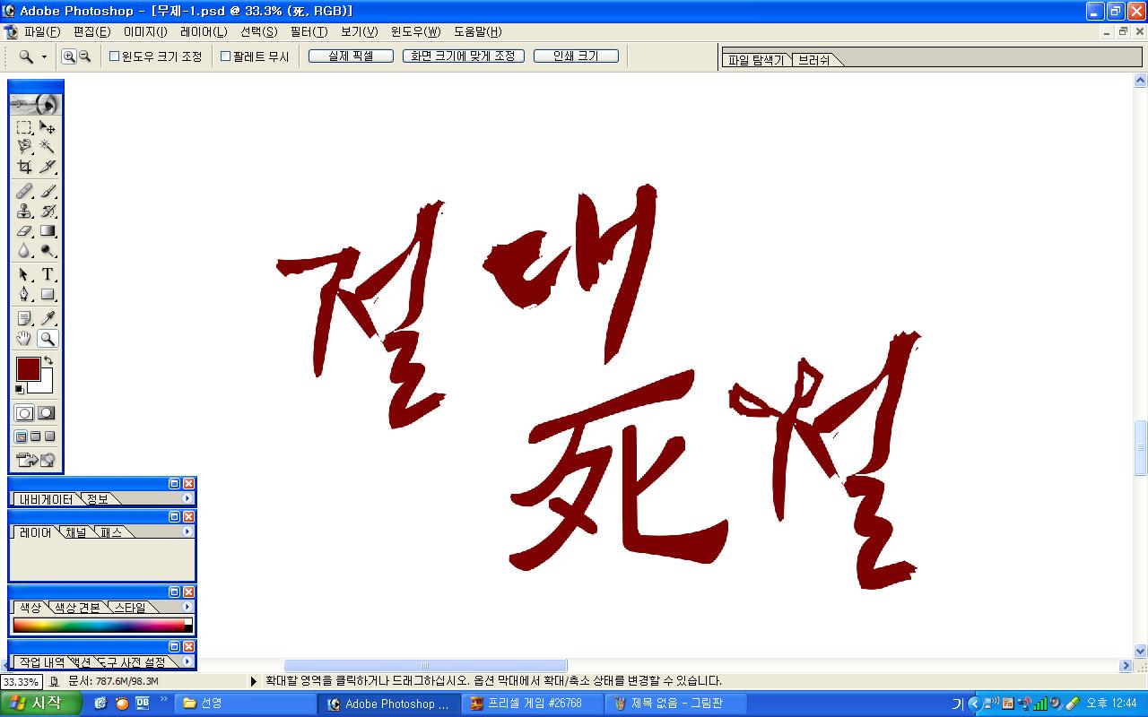 정중히 캘리 부탁드립니다. -_- 류재철 일반 0 5564 2009.11.16 11:18 실력자 분들이 많이 계셔서 이렇게 염치없게 부탁드립니다. - 절대死절 : 첨부한 파일 참고해주시면 감사하겠습니다.(약간 거친느낌? ^^;;) : '절'자의 ㅈ은 가위로...^^;; : 포스터 제작용이라 ai 파일이 필요합니다. 대학동아리 연극공연 포스터로 쓸 예정입니다. 비상업적인 공연이라 이렇게 부탁드립니다.